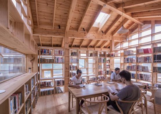 The translucent panels make up most of the cladding, creating an aura of peaceful ambience within a closed structure. The bookshelves form a cohesive material language with the structural elements of the building, blending structure with design. Bay windows form seats for readers, while allowing glimpses of the mountainous countryside beyond. The plan has deliberately included many layers of transparency. Book cases act as barriers which in turn form corridors, reading spaces and little nooks. Each space is cosy and seperate but linked through sight. The result is a myriad of layered space.