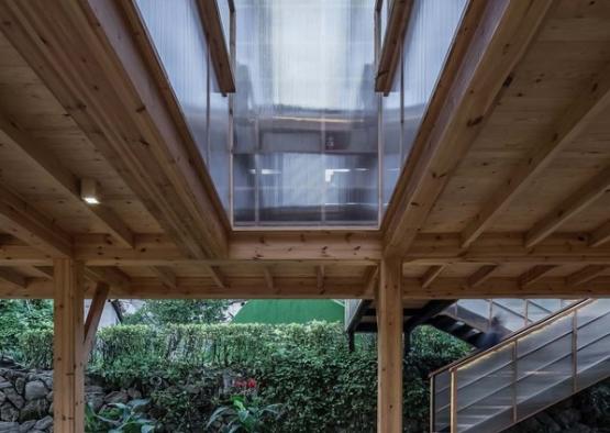 The second floor is connected to the outside via an external staircase, also clad in translucent material.