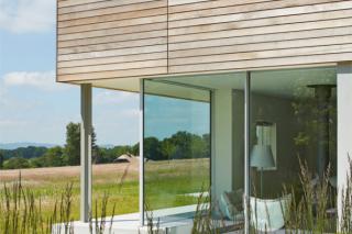 An ancillary building in the arrival courtyard houses a biomass boiler, which provides the heating and hot water. The house, flanked by a formal garden and a wildflower meadow, is built to high environmental performance standards. It replaces a 1950s cottage on the 12 ha site.