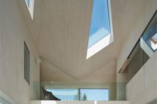 The first floor construction is entirely of cross-laminated timber. The roof is made from tilted triangular planes, forming a folded, undulating surface inspired by the form of distant hills.
