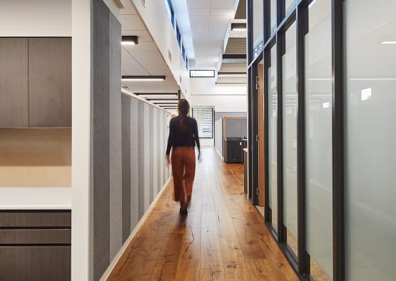 The internal surfaces, be they walls, partitions or ceilings, are acoustically treated. Some of the walls also feature acoustically-treated fabrics (up to 2.4 metres) to make open plan offices comfortable to work in. All internal timber used low VOC coatings and natural oil.