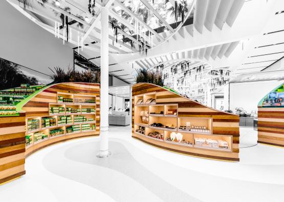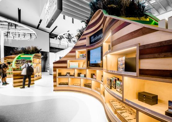 The retail layout captures the topography of the harbour inlets as seen from the air. Just as the harbour foreshore is different in every spot, so too the curved timber display stands are each unique, in shape, height and size.