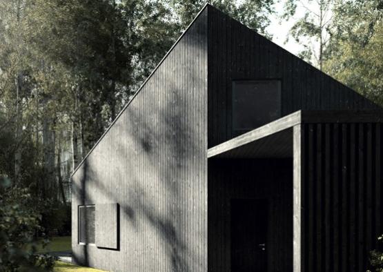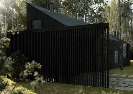 We designed an all-black house to be built amid the trunks of a forest of birch trees. The dwelling is entirely clad with dark Thermowood, lending the project a stealthy and brooding presence. We sought to place the house between the trees, while ensuring maximum exposure to the sun. Internal spaces are organized accordingly, brightly and naturally lit.