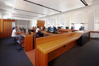 A natural flow between the external and internal spaces was achieved through using similar colours and grains; for example, Spotted Gum veneer joinery blends with the solid Spotted Gum external cladding. "Veneer is a more economical and sustainable use of timber," said Troy Thirlwell, Project Architect, Cox Architects and Planners.