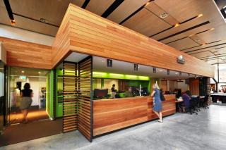The recycled Blackbutt used for the external seating is a feature of the space, and the solid Spotted Gum decking is strong and durable, as well as attractive to look at. "I specified the Spotted Gum for the cladding for its varied colour and grain," said Troy Thirlwell, Project Architect, Cox Architects and Planners. "It is a distinctive timber that visually stands out."