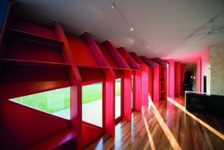 Red-stained timber box beams make a bold architectural and structural element. Inside, plywood box beams are lined with shelves that extend through the house.