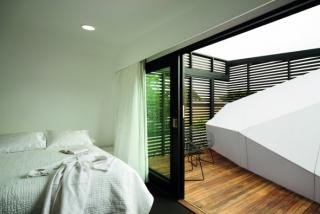 Structural engineers, Perrett Simpson Stantin, played a critical part in developing the ‘cranking' exterior wall that is the building's primary structure. This wall supports the planar exterior that curves over the verandah. Its red-stained plywood box beams allow for a high-raking ceiling, create storage and are an eye catching feature.