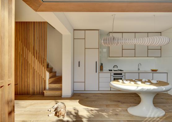 Every surface is a considered design element and storage is created along every possible surface. The dining/living area features custom floor to ceiling shelves made from solid plywood. The new kitchen features a four-metre-long Corian bench. White laminated solid plywood shelving was used primarily to construct its new storage system and further its streamlined appeal. A timber screen is designed to function as staircase balustrade, which leads to the private living areas upstairs.