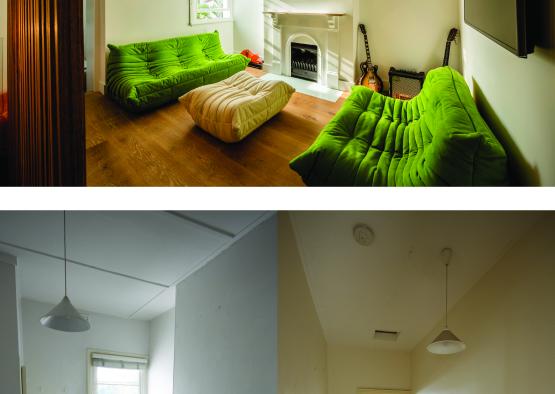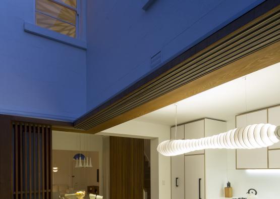 Prior to its renovation, the terrace house was furnished with an old flooring system that had three different surfaces, tiles and timber. To overcome the issue of going over budget due to the cost of removing the previous flooring, a new timber flooring system of French lime washed oak floorboards was utilised to be laid over the existing flooring creating a streamlined aesthetic across the entire floor. The strategic use of this timber flooring system significantly reduced the time of renovation. The renovation was able to avoid the costly repair and removal, and the time needed to deal with the different surfaces. The strategic use of timber floor boards also extends beyond its cost and time-saving properties – the streamlined timber floor boards also effectively connect the terrace’s dining, living and kitchen areas seamlessly into one continuous space.