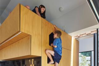 Hidden above the central console in the kitchen is a sneaky spot overlooking the dining and living areas. Lined in synthetic grass, it is a hideaway within the centre of the house.