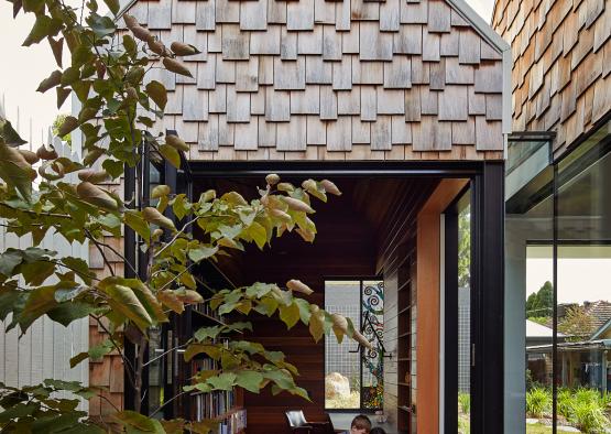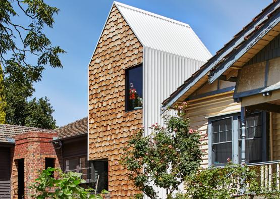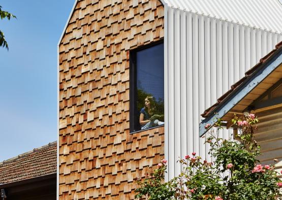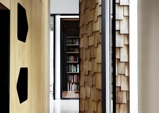 Western red cedar shingle cladding is used throughout the exterior of the new addition. The shingles were selected as a natural timber material to provide a counterpoint to the white, machine made, straight-lined colorbond cladding, used on the sides and roof of each ‘tower element’. Each face with shingle cladding has its own personality provided by the natural quality of timber, random pattern and hand-installation. Cedar shingles are brought through from the exterior into the wall lining of the project in selected locations – hiding the door to the master bedroom.