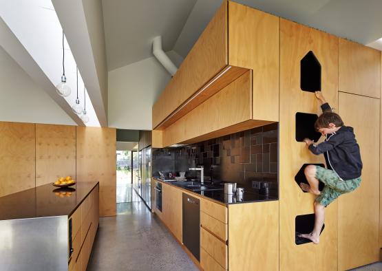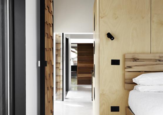 Timber is used selectively in this project to enhance the quality of internal spaces, to provide warmth and texture and to create an atmosphere of tactile beauty within the house. The Cedar shingles from the exterior of the building are brought through into choice locations, such as wall lining and to clad the door to the master bedroom. Within the kitchen and dining room plywood sheeting conceals doors and joinery, as well as softening the room. The spotted gum lining in the study creates a chapel like atmosphere. Spotted Gum internal lining to the walls and ceilings, western red cedar shingle wall lining and door cladding and hoop pine wall lining, door cladding and cabinetry are present within the project. Within the kitchen and dining room plywood sheeting conceals doors and joinery as well as softening the room as a balance to the white plaster finish, the steel bench top and the concrete floor.