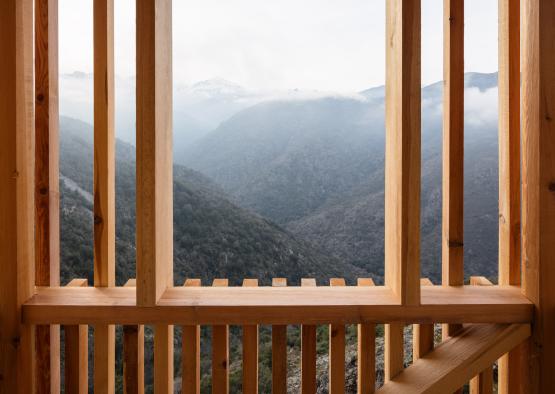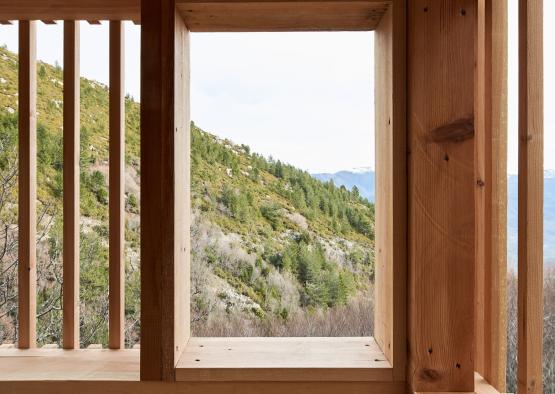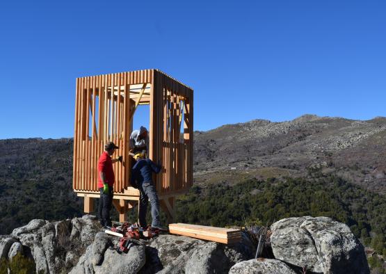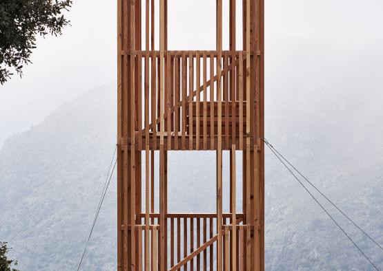 The three observatories all have matching rectilinear forms that resemble tree trunks, or sentry towers. Built by local artisans, the structures perch on rocky outcrops in the rough landscape. Each pavilion has been adapted to its location within the nature park.
