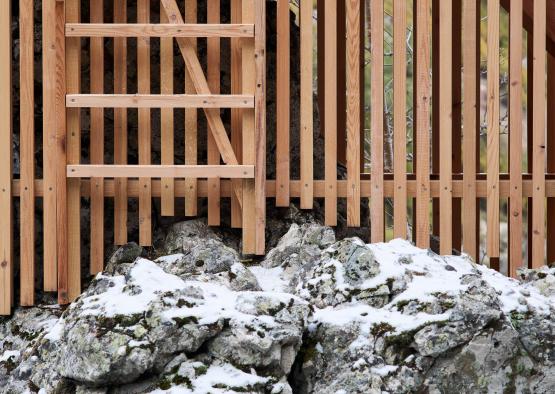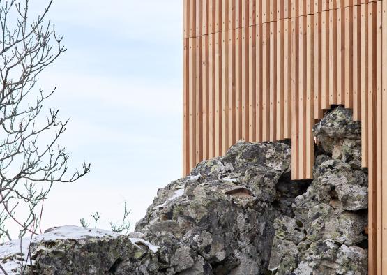 The timber post frames of the observatories are anchored directly to the rocky terrain via metal fittings that are driven into the rock. The cladding of the structures are unevenly cut at the base to follow the topography of the land and blend in with the foundations as much as possible.