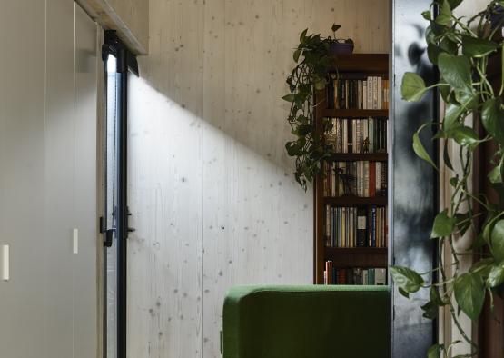 Complementing the insulating properties of the timber CLT is a wide array of thermal mass. Recycled brick walls and a ground floor slab regulate the temperature inside the home.