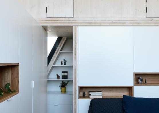 An open plan living/dining/kitchen is filled with secrets and surprises, including an outside escape route for the family’s two Siamese cats. Cupboard doors are constructed from Equitone, a material generally used as an external cladding. It contrasts with the pale CLT timber and shock of camellia pink inside.