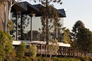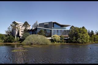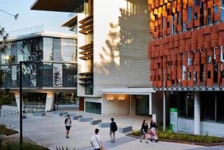 Concrete columns and slabs provide the bulk of the strength and bracing stability of the building, and their structural loads and stresses are actually monitored in real time as a learning tool. Slender timber mullions brace the vertical sheets of glazing that wrap around the building. The mullions are hardwood Hyne 21 Glulam beams made from mixed hardwoods locally grown and manufactured in Maryborough, Queensland.