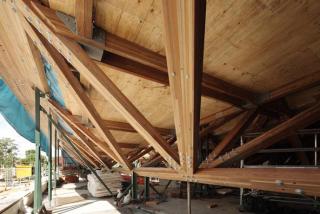 The same hardwood beams make up the chords of the statement Auditorium roof trusses and create a visually stunning impression. Some of the chord members were made from two standard beam widths (63mm or 83mm) laminated together to achieve the required strength. Chords are fixed together with concealed, slotted steel plates and chunky bolt groups that become part of the architectural expression. The modern architectural practise of minimising and concealing the structure was deliberately avoided, and instead the structural requirements are celebrated in an interesting, evocative way.