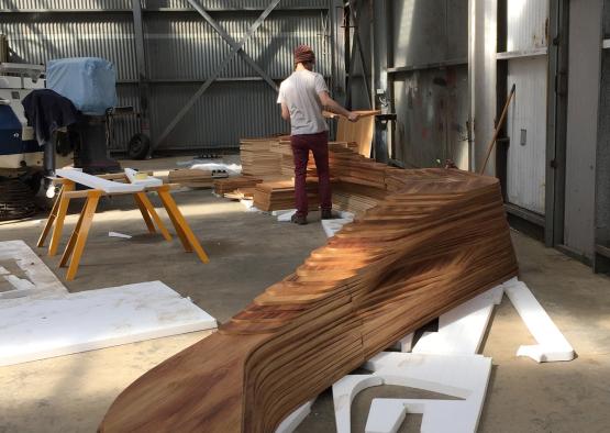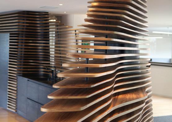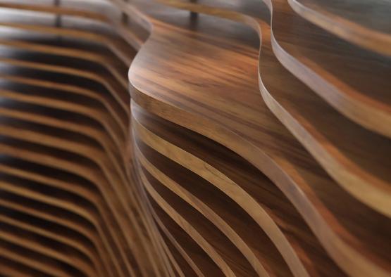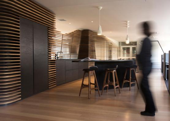The timber spine, a collaboration with alumnus designer-maker Scott van Tuil, consisting of over 400 hand-finished pieces, elevates Tasmanian Blackwood timber veneer with minimal waste and sustainably managed resources, and promotes a synthesis of traditional handcrafted jointing and fabricating with modern Parametric Design and CNC routing technology.