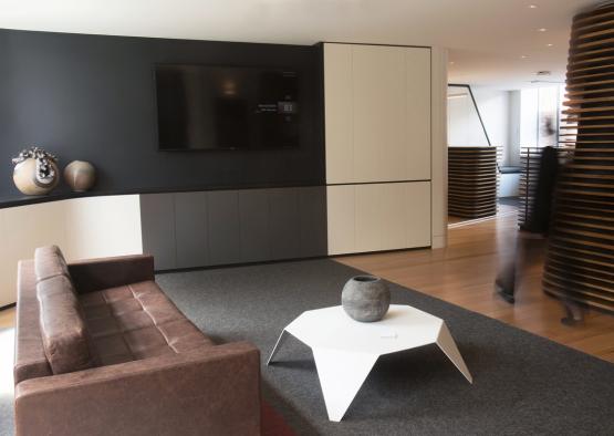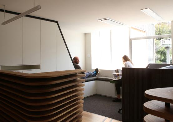 Spatial layout and the design of the joinery disguise uneven floor and ceiling levels discrepancies and unify the 290m2 into a cohesive and workable entity. The multifaceted timber spine is key to the spatial resolution and became an opportunity to value-add beyond the brief. Layered with relevance and meaning specifically tied to UTAS, timber connects to place and UTAS’ renowned timber research expertise, while each of the layers with varying thicknesses are arranged in sets of 8 representing the Faculties and Specialist Institutes within UTAS. Its fluid form guides circulation, filters light and views to activity, defines zones, separates private and public functions, enwraps the social hub and celebrates collaborations with alumni talent. The various zones provide choices for working individually or collaborating, offering hotdesks, stand up, quiet and informal work areas that encourage exchange and support a more congenial workplace.