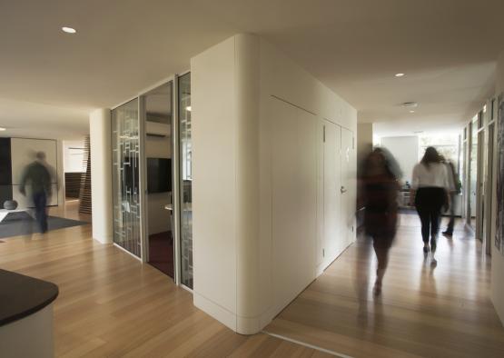 The arrangement of offices, central hub and open work areas with desks hugging the perimeter maximise natural light and passive ventilation. The mix mode air-conditioning provides heating and supplementary make-up air when required, reducing energy consumption.
