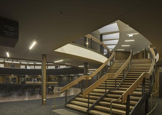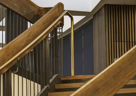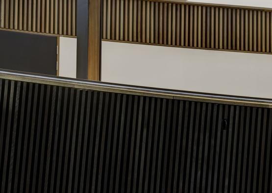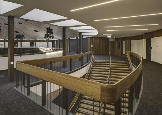 Custom acoustic panels were fixed to the curved face of the internal balcony. The panels absorb and diffuse sound, which is particularly important with a circular plan, as acoustic flutter is caused from curved surfaces in the building. A combination of natural matt oil and stained black finish were used for these panels.