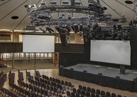 The timber panels create a useful barrier, concealing building services including smoke, and hydraulic risers. Custom batten screens were used to provide a barrier between utilitarian spaces like amenity entrances and the main auditorium.