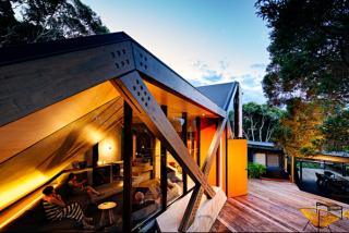 The use of timber throughout this self-contained retreat was influenced by the site context of contorting Moonah trees.