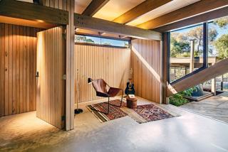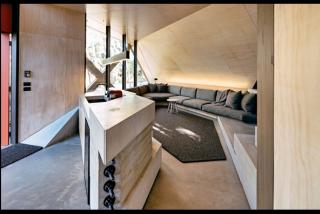 There is no definitive boundary between the exterior and interior of the building as cladding and structural elements seamlessly flow into the house from the outside.