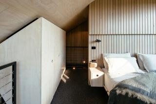 The shiplap cladding on the south and east faces outside the building also appear as feature walling in the bedroom, study and ensuite.