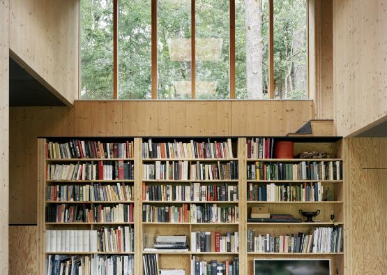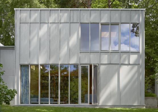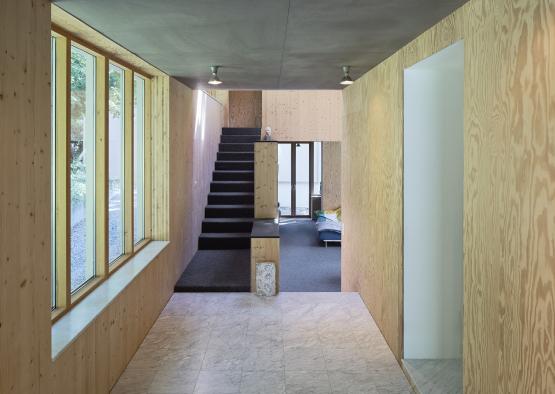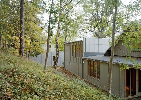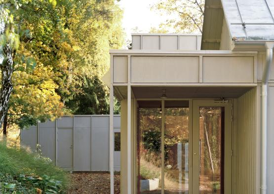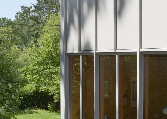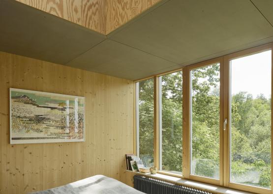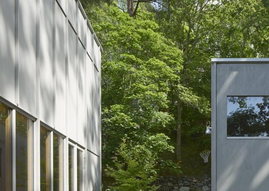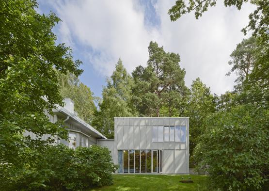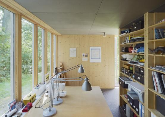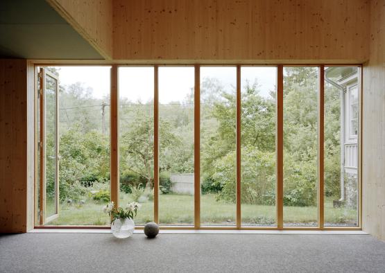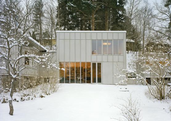 A new zoning scheme allowed the house to be expanded 90m2 along with a detached atelier. The new cottage cluster forms an extroverted spatial lawn and a more sheltered outdoor space toward the hill. The new building has been constructed in CLT from KLH. The roof structure consists of vapour retarding canvas, crossing joists and bulks of wood fibre. Roof surface of rubber sheets on the tongue and groove.