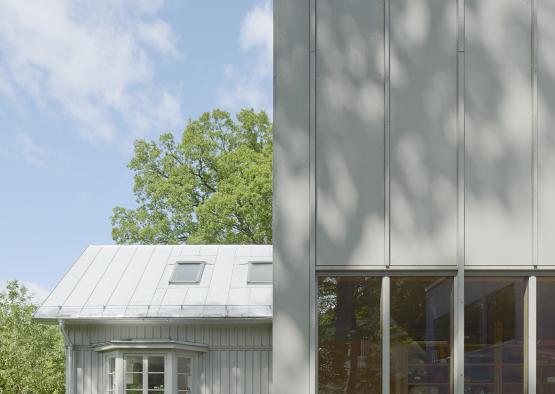 External walls are solid wood CLT covered with intersecting studs and insulation panels of wood fibre. Wind cardboard with a vented facade of plywood and wood strips was used. The entire exterior is painted in grey linseed oil. The extension façade derives from the original façade panelling but made in more contemporary materials with a new rhythm. Old, new and reinvented windows along with façade details were painted with a cohesive grey linseed oil.