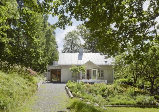 The building, from 1850, had been a summer cottage since the 1960s, and was shabby and worn down. The 60m2 single-floor cottage was quickly refurbished with a slightly raised roof into a two-floor 90m2. The house is located in Kummelnäs, Nacka municipality within the greater Stockholm region, and is one of the oldest in the area. The lot is oddly shaped compared to the surrounding plots because it emanates from an old country way stretch next to a slope bordered with Oaks. The cottage is a log house on a framework with sawdust-filled trays with a thick stone plinth. The façade was clad in the 1960s with masonite board, and in 2006, the façade got a new lock panelling. The building has experienced many ages and so the recent renovation and refurbishment by General Architecture & Kod Arkitekter is not a restoration project. Details, craft and design has been adapted due to economy, will and need.