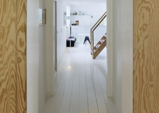 The extension is adapted to the original building to maximise and accentuate the old house body's exquisite placement on the lawn along with its vernacular roof shape. The main entrance has moved to the new extension situated in the old country road's alignment. The entrance hall is the link between the new and the old part. It is situated in the middle of the house linking two main spaces in each end: the kitchen in the old and living room in the new. The new building connects levels so that the living room levels the garden. Stairs in the house leads up to bedrooms. The inside walls are left untreated. Windows and doors are made by Lönsboda window joinery in Pine and oiled on the inside, window sills of marble. The floor is covered with marble and carpet wool. The ceiling is dark grey MDF.
