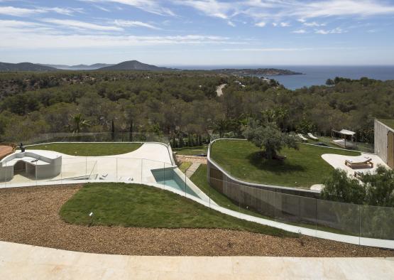 The typical central patio is the fulcrum of a complex network of multi-level paths. The impluvium is used to gather water, and it is enriched by a waterfall and creek that connects two swimming pools. The Villa shape follows the natural slope of the ground and lies perfectly on the hill, in a shape reminiscent of an amphitheater surrounded by nature.