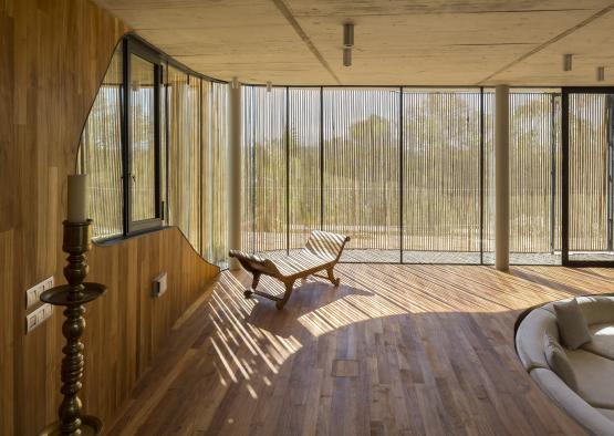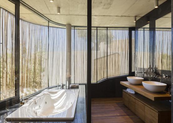 The continuous inside/outside relationship obtained by the big glass windows filtered by hanging gardens, canopies and custom-made bamboo shutters, are reminiscent of the traditional awnings and latticework of Moucharabieh. The bamboo shutters are imported directly from China because the length requested is above standard. They were cut and shipped specifically for the house.