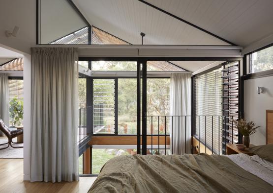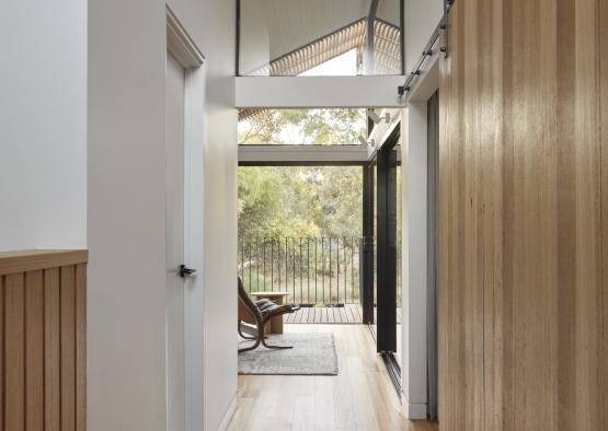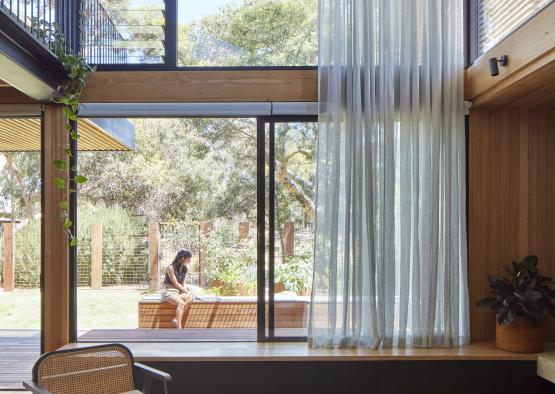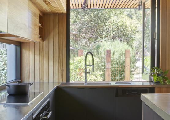 Embodied energy was reduced by using a timber sub-floor structure instead of concrete. While the mass of concrete can help the energy rating forecast of thermal performance, Ben Callery Architects have found that a well-insulated lightweight structure can be thermally efficient, with lower embodied energy.