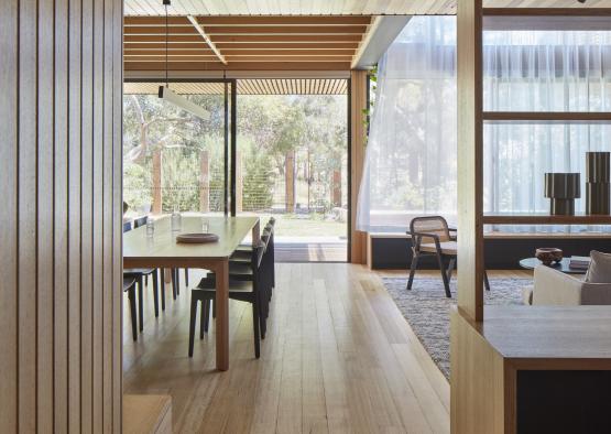 The timber floor, ceiling and cabinetry provide a full wrap of timber within the living spaces. This frames and complements the beautiful view of the parkland beyond, and reinforces the relationship with the natural environment. The dramatic view through the double storey void, surrounded by timber, creates a unique feel that is simultaneously stimulating while also tranquil and calming.