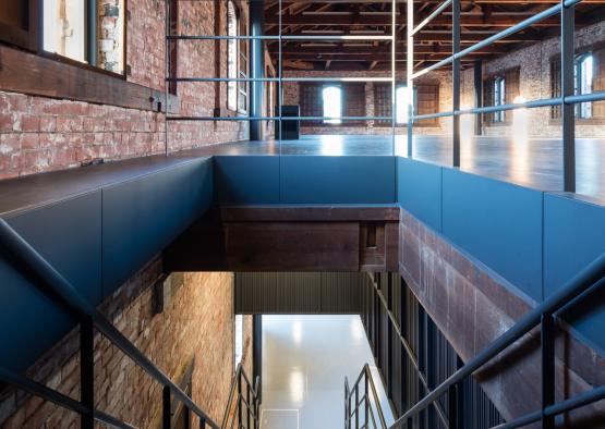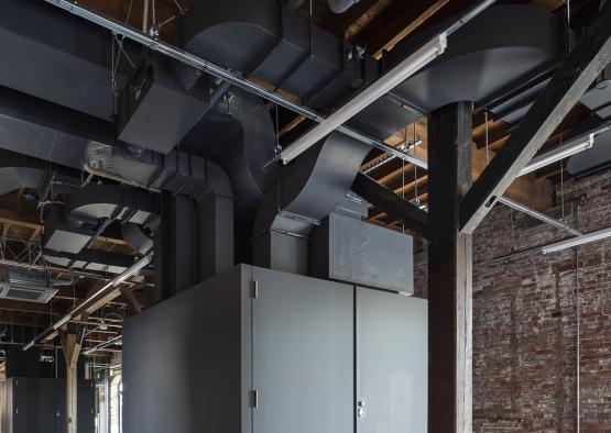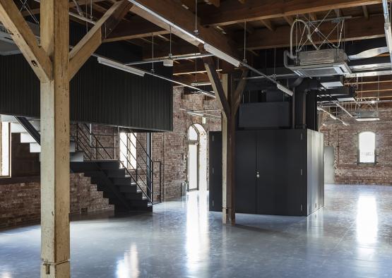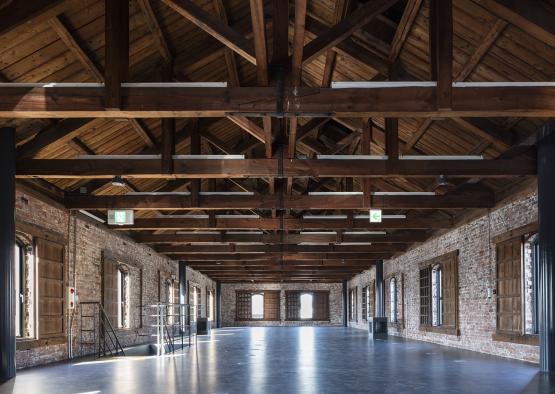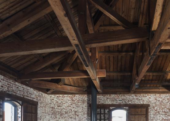 The 9m x 36m column-free space was achieved with the use of a king post and truss apex. The window fittings were designed to ventilate the space and control humidity -- according to FT Architects, the first time in history that a Japanese brick building successfully adopted these western architectural strategies. Due to several prior renovations and a lack of detailed architectural drawings, it was necessary to perform extensive research on the site prior to the renovations. The original brick wall and timber truss were found to be structurally sound, but the yield strength on one side of the building was insufficient. It was necessary to conduct seismic reinforcement of the building without interfering as much as possible with the existing masonry and truss. It was also a priority to the architects that the spatial design represented the building’s history.