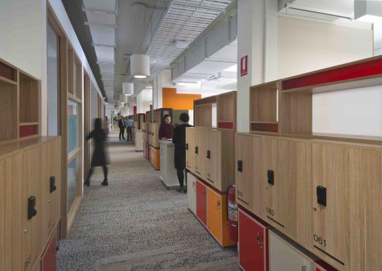 To encourage a contemporary way of working for the Research Portfolio staff at La Trobe University, the design breaks away from the conventions of a typical office fitout. The open office floor plan is broken down into smaller semi-enclosed studios for staff to work closely in their teams. Each studio is owned by the team, rather than the individual, creating a 'household' and boundaries between studios are blurred. To create a warm, welcoming staff environment, we introduced a vibrant colour palette, accented by the use of timber throughout the space. The Victorian ash glazing details create cozy nooks with acoustic benefit, while the white birch multiply lockers punctuate the corridors, semi enclosing the studios and providing rhythm through the spine of the space. Engineered oak floors through the breakout space marry with the oak veneer wall panelling to provide a high end space for both staff and visitors.