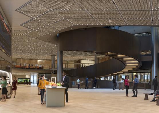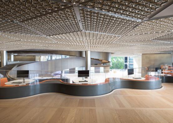 The lobby, named Vortex, is a dramatic opening statement for the rest of the building. 1858 square metres of red oak cladding were used to create a dramatic, swirling space, comprised by intersecting arching walls. Jones describes this as “a twist on the timber-lined entrance halls you find in so many classical English buildings.” To avoid the risk of reverberation caused by the application of so much vertical cladding, the timber was micro-perforated by laser in order to make it sound-absorbent. The timber itself will require minimal maintenance, due to a combination of finish on the floor, lacquer on the panelling and the natural durability of red oak.