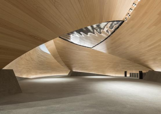 The multi-purpose space used for meetings and presentations also incorporated 1350 square metres of red oak in glulam form.