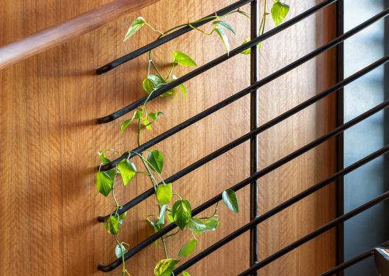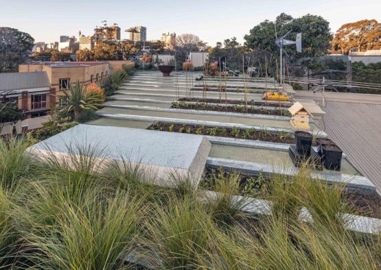 Overhead structural LVL beams support the rooftop garden, which features an array of hot dip galvanised planter beds. The LVL beams are left exposed underside, developing a rhythm to the internal space. LVL beams are thick, engineered beams made from veneers of timber, much like plywood. LVL rivals and often exceeds the strength of solid timber beams. Precise and accurate sizing of LVLs are one of the greatest benefits in terms of construction speed, but when they are cleaned up and left expressed within a space they provide a beautiful raw engineered aesthetic that can be perfectly complimented with plywood linings and joinery complimented by plywood joinery.