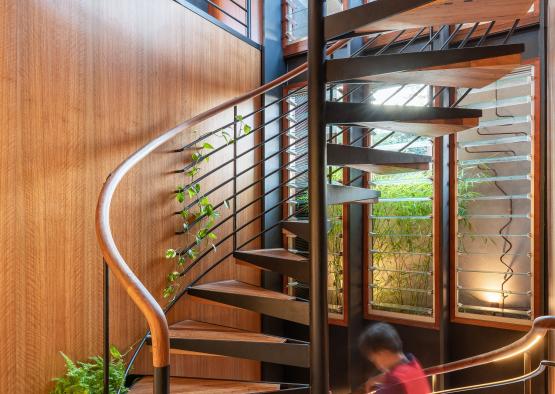 A custom steel and recycled timber stair ascends through the centre of the dwelling, connecting the two floors. The steel frame hosts the recycled spotted gum treads on the spiral staircase. The stair also acts as a light and air well, using the stack effect to draw cool air from the concrete slab and masonry wall below. Cool air lifts from the ground floor up through the bedroom and living spaces above, and pushes hot air out the operable glass skin on the top floor in the warmer months.