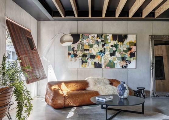 On the inside, the raw exterior textures of burnished concrete, steel and fibre cement panels give way to warm and rich timber boards lining the floors, walls and ceiling.