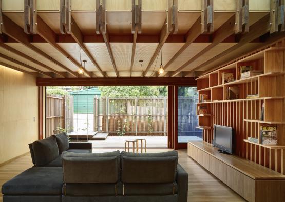 Materially the residence is a contemporary interpretation of the architectural language typical of the area – the timber framed worker’s cottage. Primarily the structure is a timber frame, supplemented by steel to efficiently occupy the site with minimal ground coverage. Stained plywood provides a durable finish to blank side elevations. Hardwood timber screening to the street and upper level bedroom affords privacy to the interior while maintaining light and ventilation. Internally the timber language is celebrated with clear finished plywood linings. Recycled structural timber joists and hangers are expressed, defining the intimacy of living areas and providing acoustic timbre. Matching timber cabinetry conceals lighting and services while organising adjacent spaces.