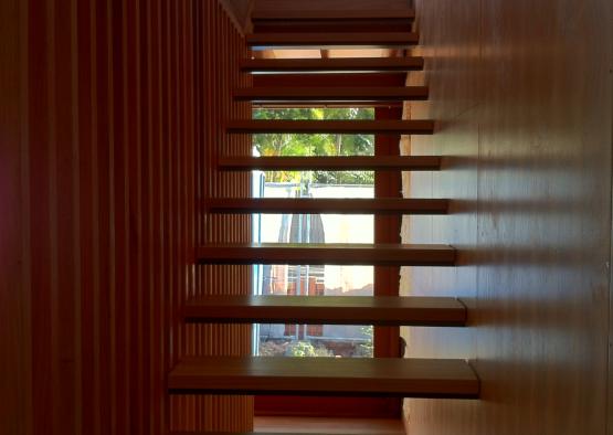 The open tread timber staircase commences from the Living Area on Level 1 up to the Main Bedroom on Level 2. The stair comprises of solid Blackbutt timber treads with a concealed steel stirrup support that is mounted within the wall frame on one side and integrated into the bespoke timber joinery on the other.