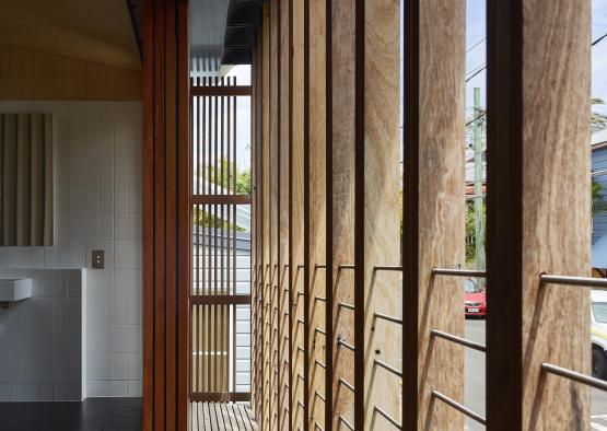 Hardwood timber screening to the street and upper level bedroom affords privacy to the interior while maintaining light and ventilation. No mechanical ventilation is used within the residence with generous openings and ample insulation allowing breezes to maintain and regulate the ambient climate.