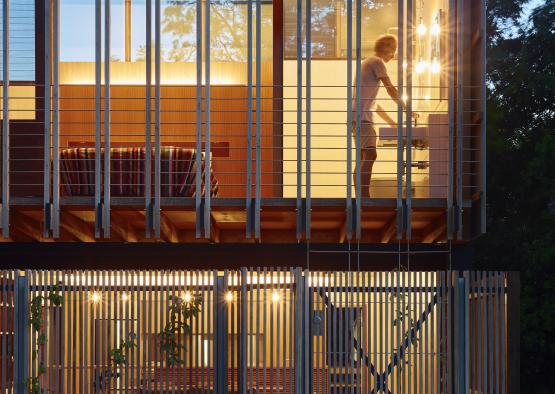 The interior structural hanger acts in tension, hanging off a purlin, off the overall steel portal. The hanger is perpendicularly bolted onto dressed hardwood 250 x 38 timber joists supported by two laminated Hyne Beam 21 made from mixed Queensland hardwoods. The timber joists continue beyond the internal living area and cantilevers out to form the structural support for the upper floor balcony. The vertical timber balustrade perpendicularly bolts onto the timber joists, acting in compression to support the steel gutter and roof above.