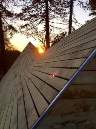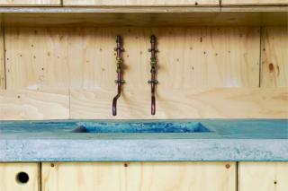 The project is a clear progression of Invisible Studio founder Piers Taylor’s work on the Architectural Association’s Design and Make programme at Hooke Park, which he helped to found. The mess building echoes Hooke Park’s Caretaker’s House. Many of the same details are employed: the copper taps, plywood interior, covered entrance and timber cladding.